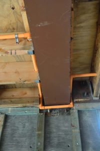 In some ways, the most interesting, because I had never seen it before, was the rough plumbing for the interior, fire-sprinkler system. In the house, they used a special, high-temperature PVC pipe — the orange pipe in Picture 1. As picture 2, shows, all of the trades are having to find creative ways to get past the steel, structural beams. In the garage, where the piping will not be covered by drywall, the piping was copper; shown in Picture 3.