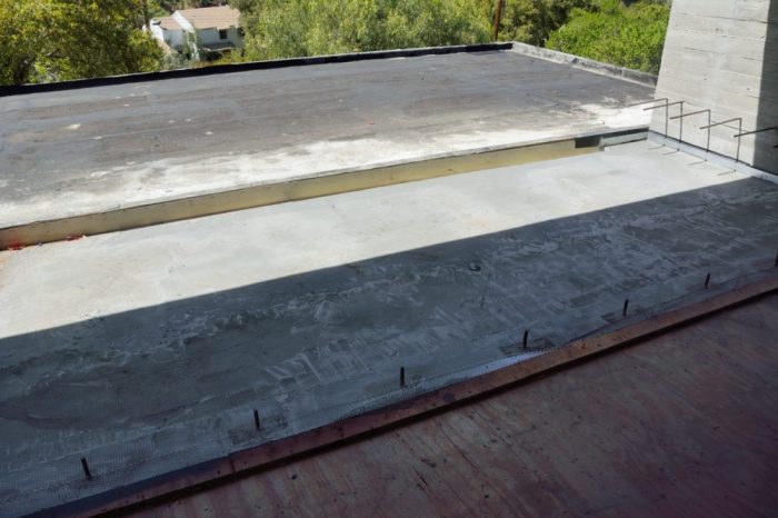 Picture 7 – Finished concrete surface of the deck outside of the office, with the base of the green roof for the house behind it. In between is a drainage channel.