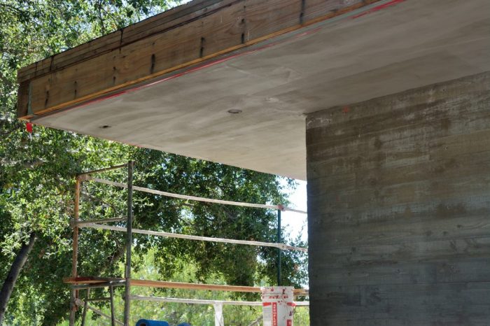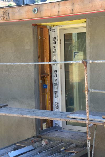 The dry wall installers have completed all the joint taping and spackling in the house and the apartment. It looks very good, but there is nothing really to show in a photo. The stucco folks did not get as much done as we had hoped. We thought that we would see at least some of the final coat of stucco up, but they are still working on the base coat. As Picture 2 shows, they did get the sheathing installed underneath the eaves and the base coat on that. However, as shown in Picture 3, there is still one small piece of the wall that needs sheathing before this part of the process will be done.