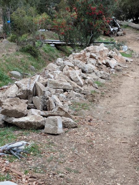 The space where Pete was having the concrete dumped filled up, so the last piles were put along the top of the gully along our Western driveway.  Pete says with a couple of day laborers, he can line the gully with them in a couple of days. This picture is looking down the driveway towards the street, from just below the chicken coop. The main pile that Pete is currently working on is just to the right off the bottom of the photo.