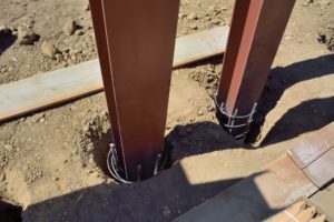 They were able to drop the long rebar cages into the very deep holes fairly easily. At 9:30, they were doing the 4th.  The rebar cages for the gabion postholes were the wrong size at the top for the I-beams, and had to be modified. That took quite a while.
