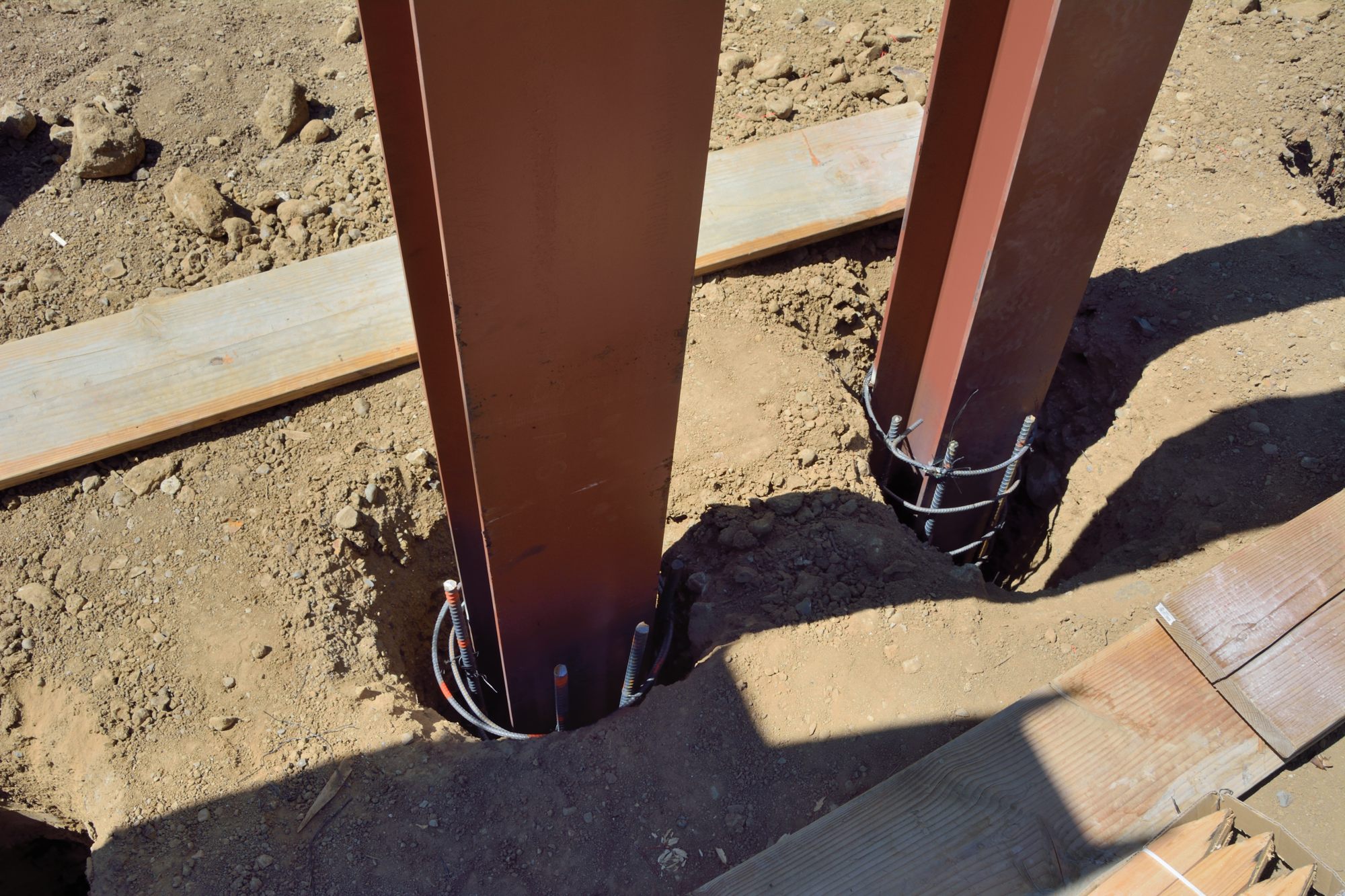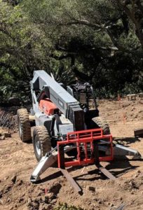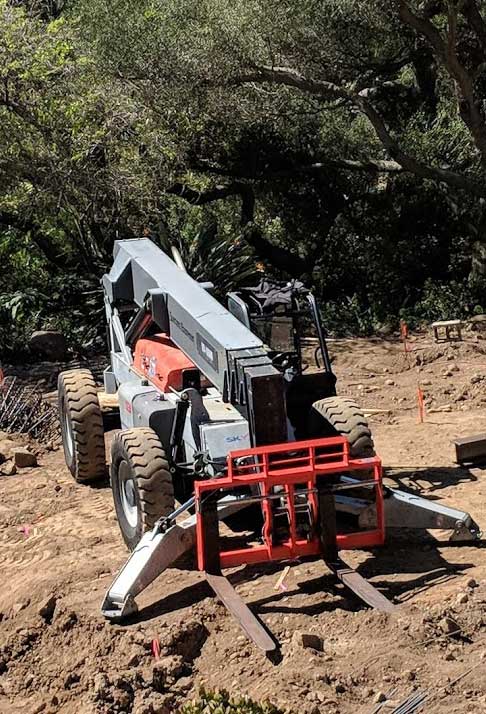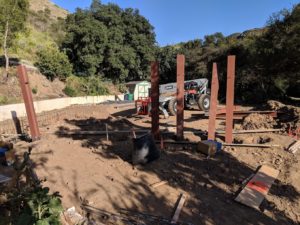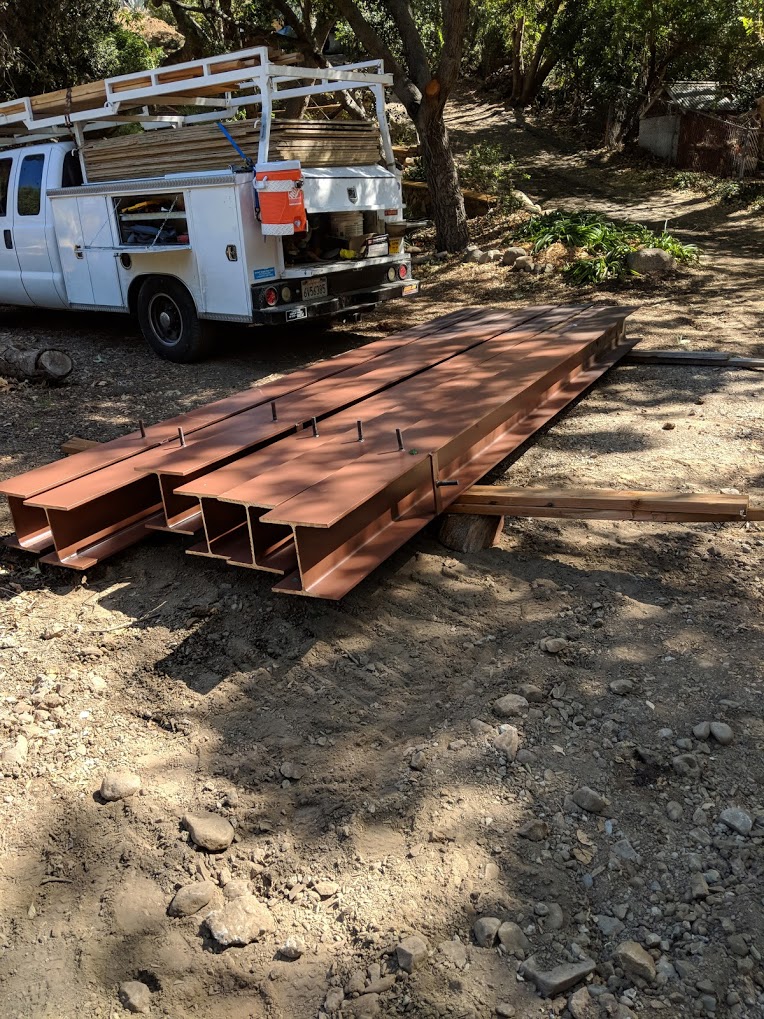 I arrived at the property about 7:30 AM to see a big pile of I-beams in the front yard.  A very long transport truck had just dropped off a machine, which is not a crane, but can function as one for what was needed here. It could lift the rebar cages and also the rebar cages with attached I-beams.  But in the early morning, the problem was trying to get the transport truck (85 feet long) back out of the canyon. I spent about 15 minutes trying to find the person whose car was parked at one end of a nearby parking lot preventing the truck from going around a loop and also trying to call the manager of the Wildlife Sanctuary 2 doors down to open their big parking lot.  All to no avail. When I say “call,” I mean yelling because the manager has no cellphone. However, when I returned around 9:30, the driver had gotten out somehow.