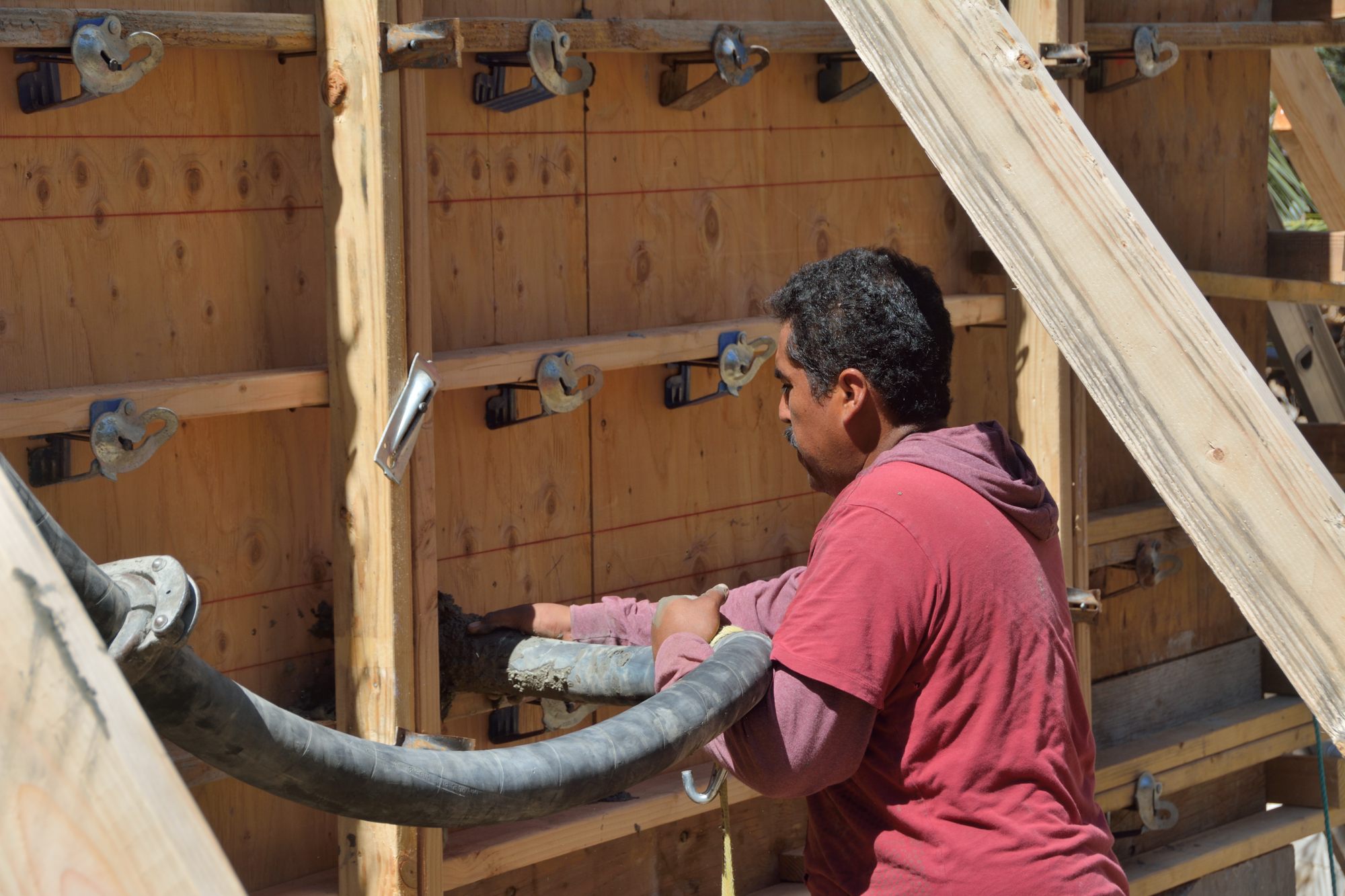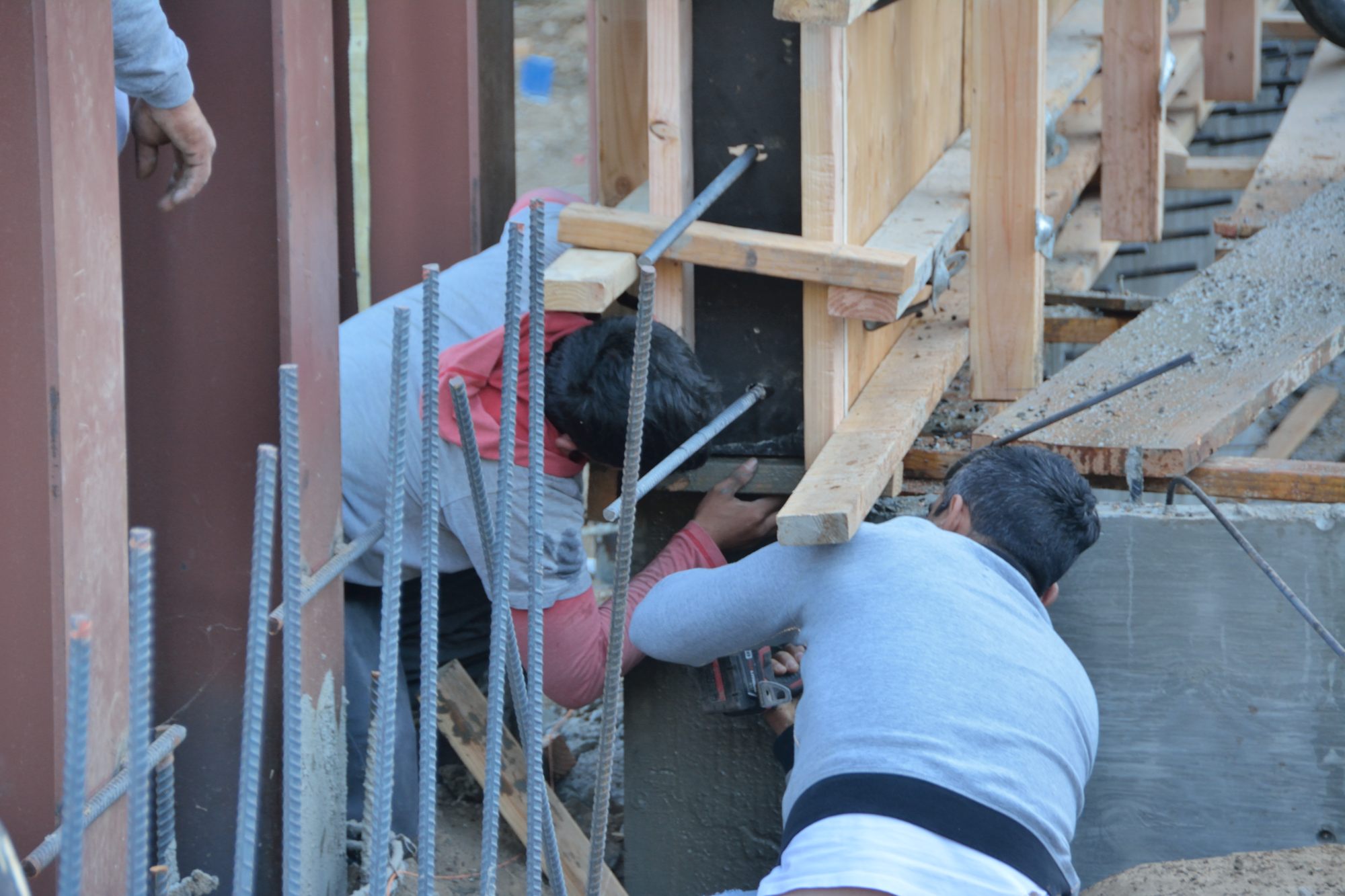 You may also remember from yesterday’s post that they put wood frames in the forms to block off openings for doors and windows. The windows, however, do not extend to the floor, so it is necessary to get the concrete into the forms below the blocked out area. How do they do that? It turns out not easily and possibly not well — they may have to come back after the forms are off and fill in some voids. Picture 5 shows one approach. Here Javi drilled a large hole in the plywood of a form just below the area where the window into the laundry room was blocked off. He is using the hose from the concrete pump to pump concrete into the space in the wall below the window.