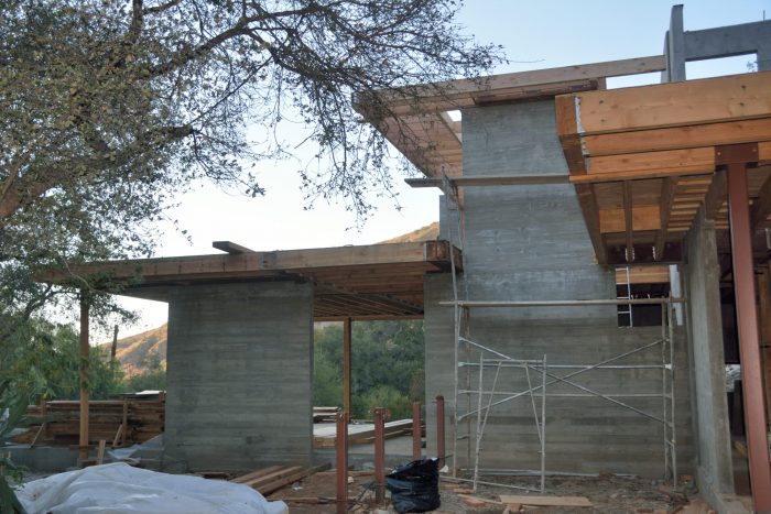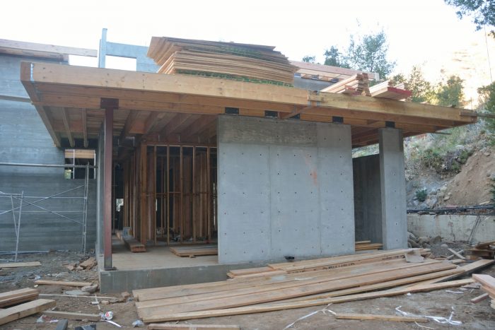 Picture 2 shows the area near the front entrance — the front door will be where you can see the large gap in the first-floor, concrete wall, just to the left of the scaffolding. With the overhangs of the second floor framing in place, it is possible to get a better sense of what this area will look like.