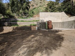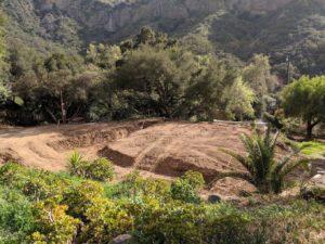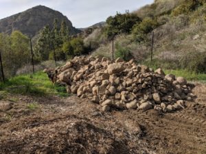 The demo people came on Wednesday and removed most of the rock from the house site and took it up to the rock pile up the hill, but their bobcat broke down again and they had to stop. They came back today and finished the job. This was necessary because the surveyor is coming on Monday and then on Tuesday they will start digging the garage foundation piers. Look at the nice clean house site and garage site. And look at that rock pile. Pete swears he will find a use for all those rocks.