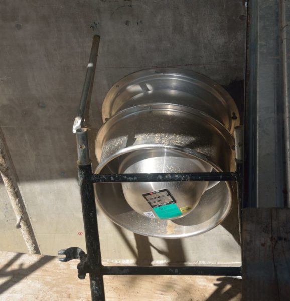 Picture 3 shows the large fan unit that the HVAC people installed on the back of the house. Fortunately, it will not be too visible there. This fan will draw air through the crawl space to keep it dry. That air will, in turn, be drawn from inside of the house. Apparently with a house as solidly built as this one, it is necessary to have a fan that continuously draws air out of the house so that fresh air can enter the house. Although the unit is large and will run continuously, it does not actually draw that much air — the size is for efficiency and noise reduction.