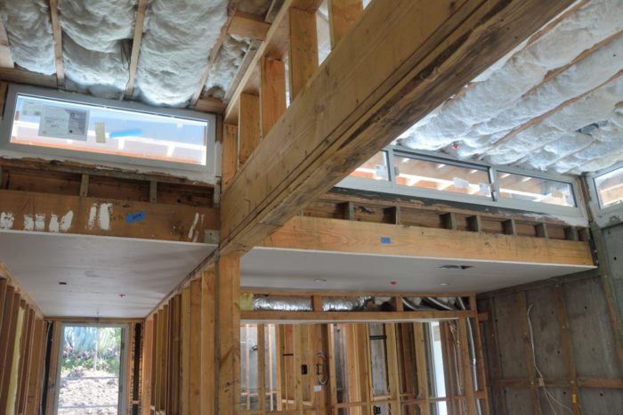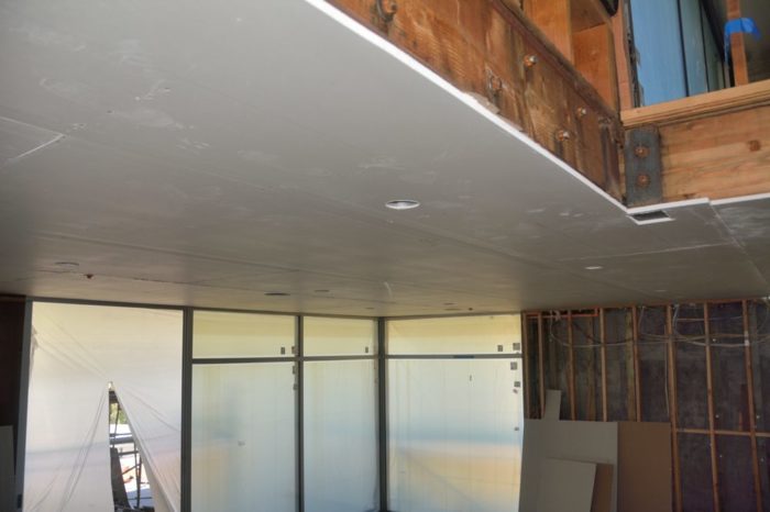 They also continued putting up drywall on the ceilings. With the pocket for the sliding door in the great room in place, they were able to do that room (Picture 4). They also did the low-roof, but not the high-roof ceilings upstairs (Picture 5). Unfortunately, they cannot do the walls until the door frames are in place. Those door frames were originally to be delivered last Friday; then they were going to come today; the word today is that they will be delivered NEXT Wednesday — very frustrating since all the interior work has ground to a halt waiting for this.