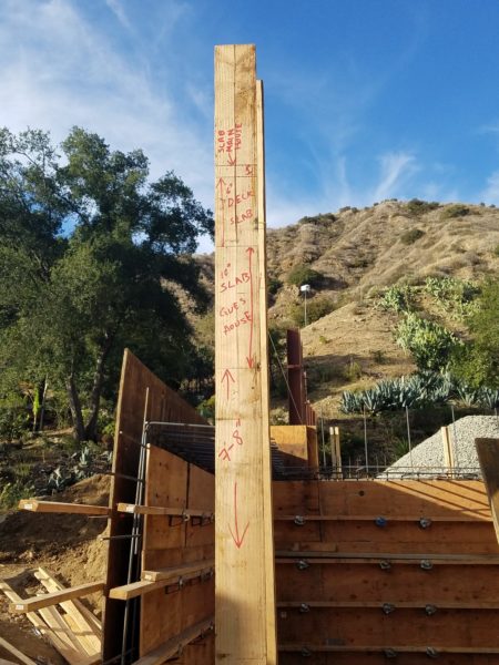 In the background of this photo, you can see some of the completed forms for the area under the deck. In the foreground is a 2×4 that our contractor marked up to illustrate a problem. Yesterday’s post mentioned how the level of the first floor of the house continues (with a step down of one inch) to the deck and that level was to be the same as the top of the 6″ deep green-roof planters that sit on the top of the apartment roof. The ceiling of the apartment, measured to the top of the slab that is the roof is meant to be 8′ above the floor.