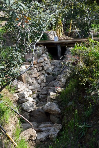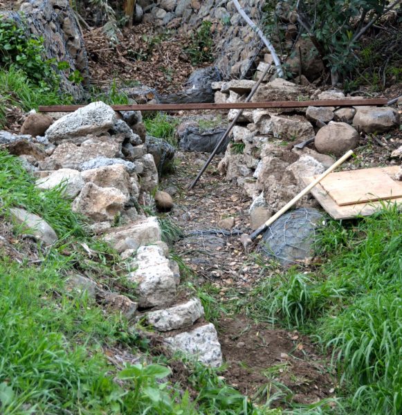 Picture 6 – Pete has begun work using the salvaged concrete from the house to shore up the lower part of the western gully. The piece of wood across the gully is close to where a new bridge is to go.