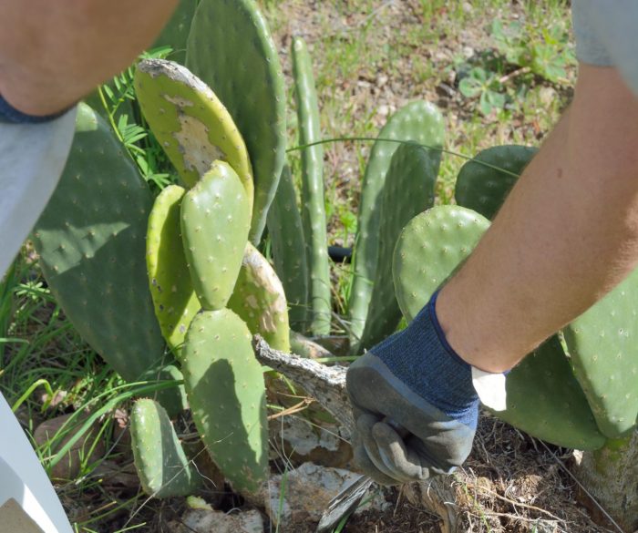 Pete is cutting pads that we will transplant from an established plant. This is actually a plant that grew out of a pile of cactus pads that were cut previously but then not planted and simply left in a place where we had not intended to grow cactus. Although these cacti are spineless, they still have short, fine thorns and so good gloves are important.