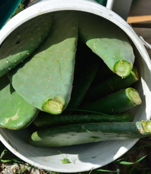 A bucket of pads ready to haul up the hill. These are nice, juicy pads, so a bucket full weighs 20+ pounds. (And the hillside is steep!)
