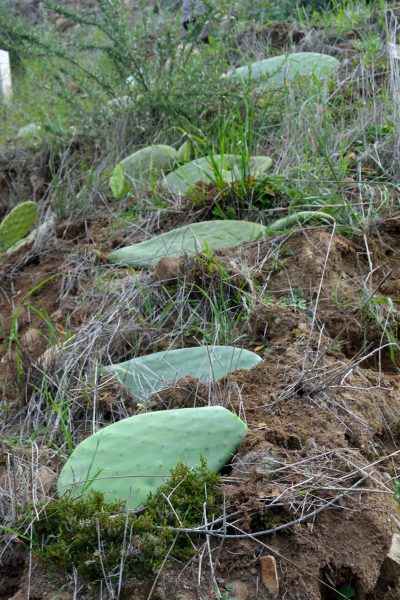 Here you can see pads planted on the edge of and just above the section that fell away. Once these are established, we can cut them back and use them to fill in the areas below. (It is so much easier to let the cut pads slide down the hillside to where they are needed than to haul them up!)