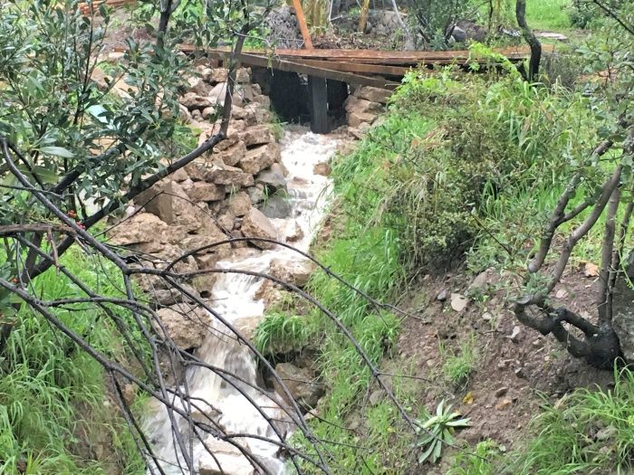 Picture 8 – Water flowing through the newly hardened gully and under the almost completed new bridge.