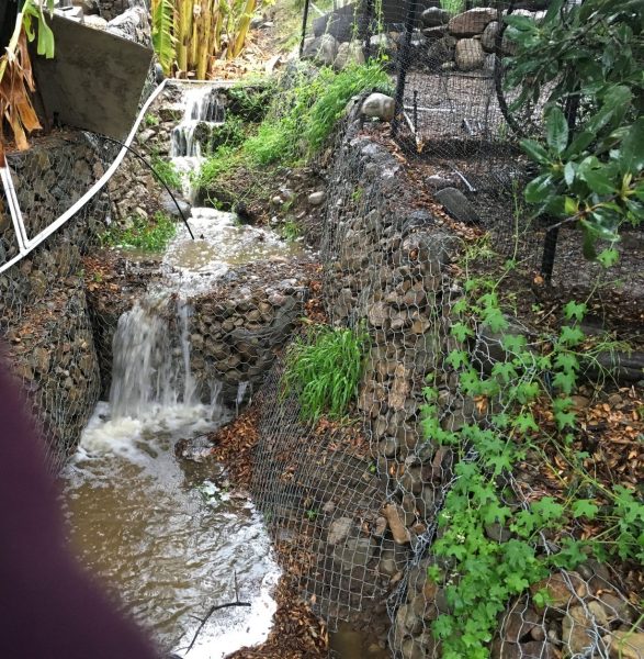During the construction (before Picture 7 was taken), we had a period of particularly heavy rain. Pete took Picture 8 of the water in the newly channelized gully. This is the most water we have seen in this part of the gully since we put in the gabions. What is nice about the broken concrete construction is that it protects the bottom and sides of the gully from erosion, while the uneven surfaces, created by the stacked concrete, creates turbulence that slows the water down, and the joints between the loose laid sections of uneven concrete allows much of the water to sink into the soil, reducing the flow down hill. Pete also took Picture 9 at the same time. This shows the water flow higher up the gully, by the chicken coop. This is an area where we used gabions to harden the gully.