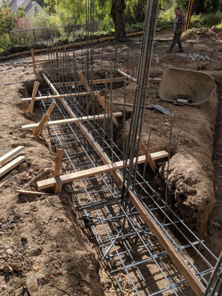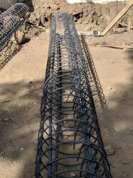in front of it. It did not have an easy time of it, having only dug out two of the deep caisson holes, but they started with the hardest ones. They had to move the machine to dump the dirt, which was time-consuming. There are 4 more of those holes to do. In the meantime, the wiring guys were busy. They added even more rebar to the house foundation and a great deal more rebar to the garage.