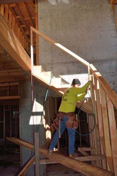 The framer in Picture 2 is getting set up to finish the framing for the railing for the stairway to the second floor in the house