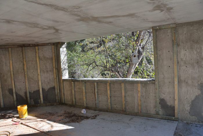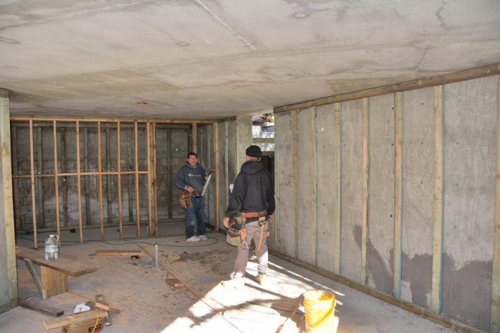 But the exciting development today was the start of the framing for the apartment. Picture 2 shows the green lumber attached to the concrete, exterior wall surrounding the living room window. This will both provide a nailer for the Sheetrock and space for wiring and electrical boxes. Picture 3 shows the framing for walls forming the bathroom and pantry.