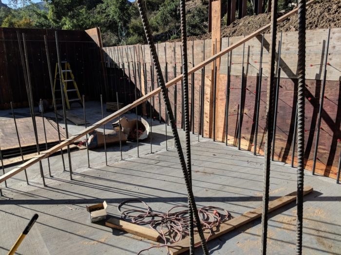 Ted & I were both in Irvine most of the day.  According to our neighbor, Michael, the steel guys spent a large part of the day measuring. They did get two walls put up behind the garage: the back wall, and one end wall. They have only put up one side of each, however. The end wall, on the left, in the photo, is covered by afternoon shadows.