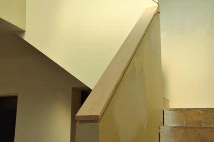 We have been a bit worried about people putting hands on the top of the stairwell wall. Although there will be a handrail to hold on to, the wall in many parts is a bit too easy to put your hand on. So the carpenters came up with a piece of wood on top of another piece of wood, which will mimic the look of the floor moulding. The bottom layer will be painted, and the top layer stained to match the mahogany doors.