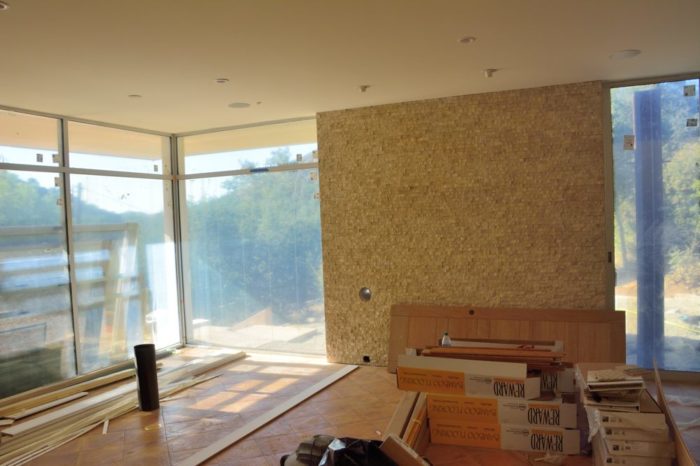 Sometime in the last two weeks, the tile guys finished putting the stone on the wall of the great room behind the woodstove. It’s kind of an off-white color, but it looks more colored on my monitor.