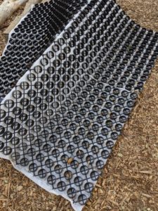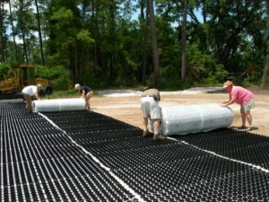 They delivered the gravel and the plastic holders for the left-hand driveway a couple of weeks ago, but the contractor didn’t want to finish the drive until the final heavy concrete truck was gone. We are using a system called GravelPave2 for the new driveway. The plastic circles will be filled with gravel and any water that flows down the driveway will filter thru the gravel. The picture on the right is from the internet and shows people unrolling the spools of plastic.