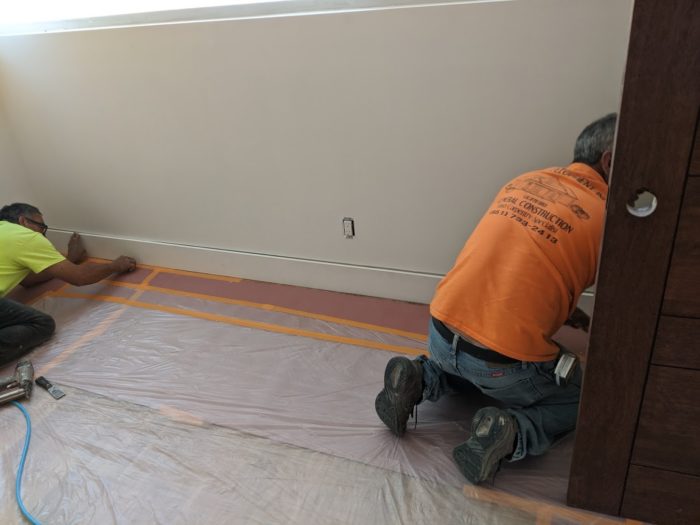 Once the flooring was in, the carpenters arrived to cut the floor moulding.