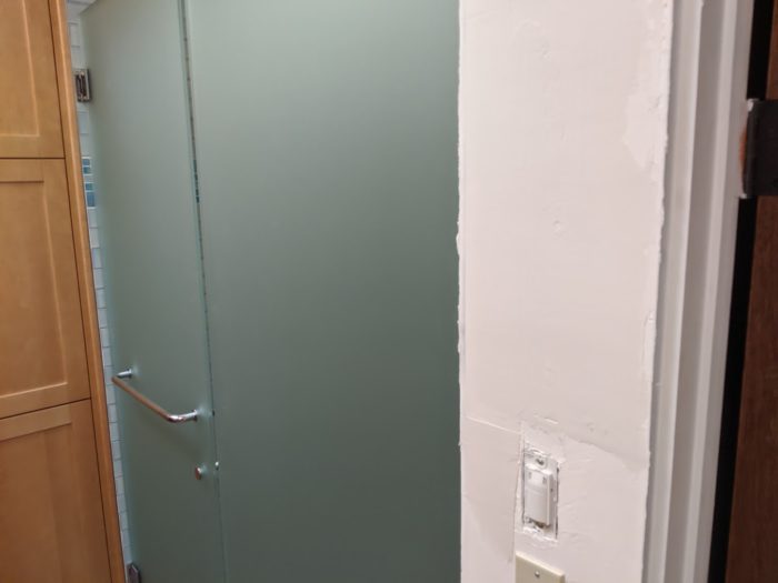 Two of the three shower doors have been installed. The contractor assumed we would want clear glass since that is what modern houses usually have. We were both opposed although for different reasons. Ted doesn’t like the problems of hard water streaking on the glass, and Nina doesn’t like being able to see in. So we got some acid-etched glass, which turns out to be sort of greenish in color, which matches the apartment and master baths perfectly. It may not be perfect in the guest bathroom, but we’ll have to wait and see.