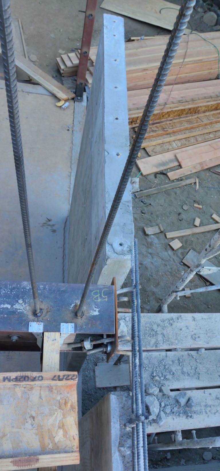 Picture 8 was taken back on October 22nd, when this beam was being installed. What you are looking at is the beam being maneuvered into place to connect it to a bracket embedded in a concrete wall on the south side of the house. What is a little hard to see is that the this connection is to a short span of concrete wall that is sitting above a window. The problem is that this piece of cantilevered concrete (and its rebar) might not be able to support enough of the weight of a concrete wall even with the help of the steel posts once they were extended.