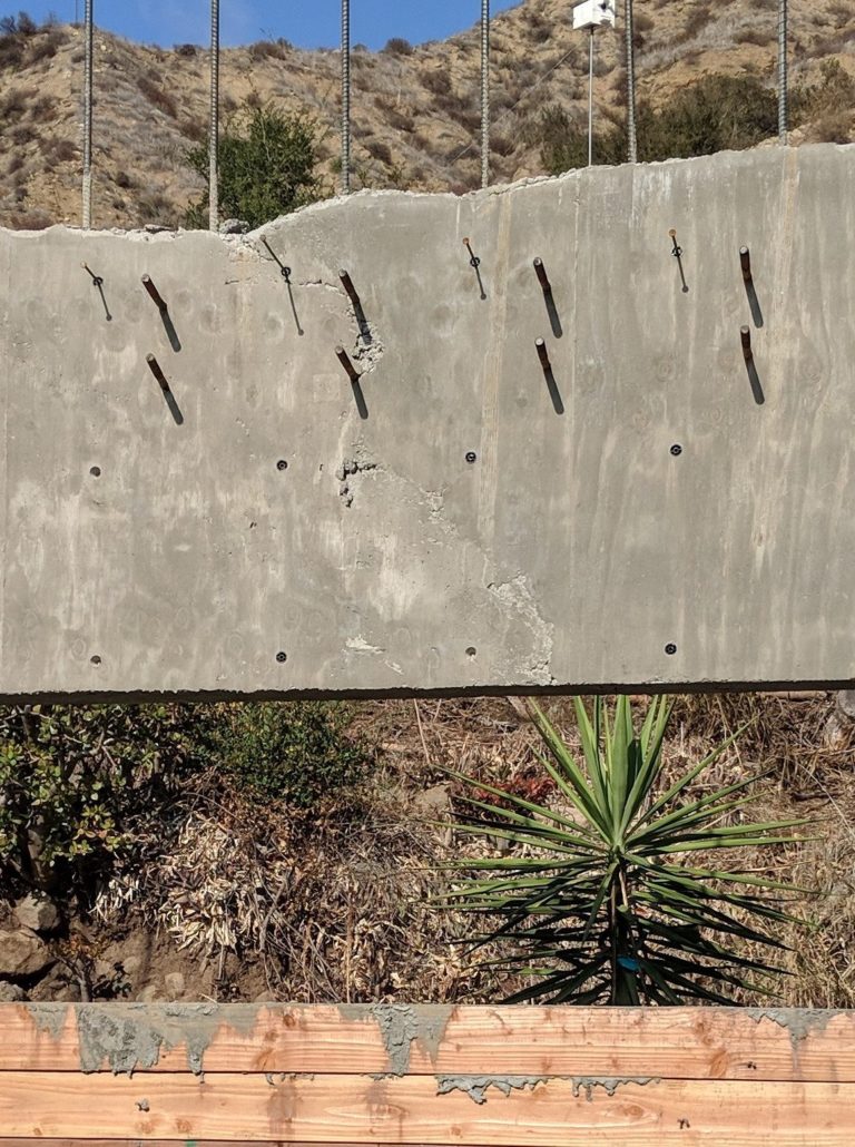 We did, however, manage to resolve one issue that was worrying us. After consulting with the contractor and the structural engineer, a plan was developed to deal with a “cold joint” in the concrete span of wall over one of the windows. (The diagonal line of imperfections in the concrete is shown in the picture below.) This occurred because, when this section of the wall was being poured, the section on the left exhausted the delivery of one truck and the second truck did not arrive for over an hour, so the concrete on the left was already partially set when the concrete on the right was poured. (The trucks are meant to arrive shortly after one another, but the supplier does not always cooperate.) Fortunately, all that is necessary is to remove the “honeycombed” concrete at this joint and then patch the gap with special materials.