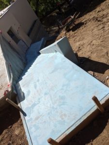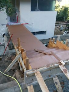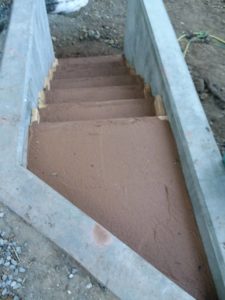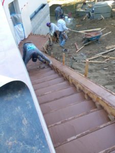 Today they poured colored concrete for the long staircase from the garage up to the apartment and on to the deck, a short staircase from the other driveway up to the backyard, the bridge to the backyard, and the front steps. After they poured the cement, they coated it was some blue liquid that keeps it from drying out too much. Tomorrow they will scratch the surface and the aggregate to show some of the stones and make it rougher. The contractor sent photos of the brown concrete, by the time Nina was out in the afternoon, it was all blue.