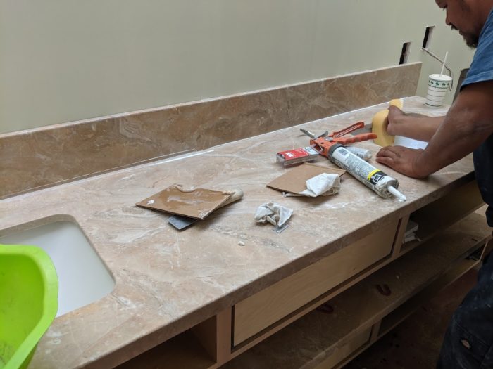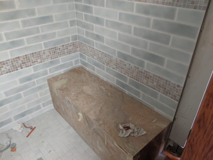 At the same time, the tilers have been busy putting in counters in the master bathroom and guest bathroom. The apartment has been closed up while the staircase was being built.