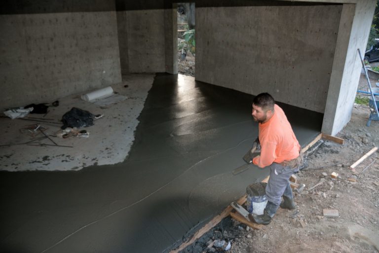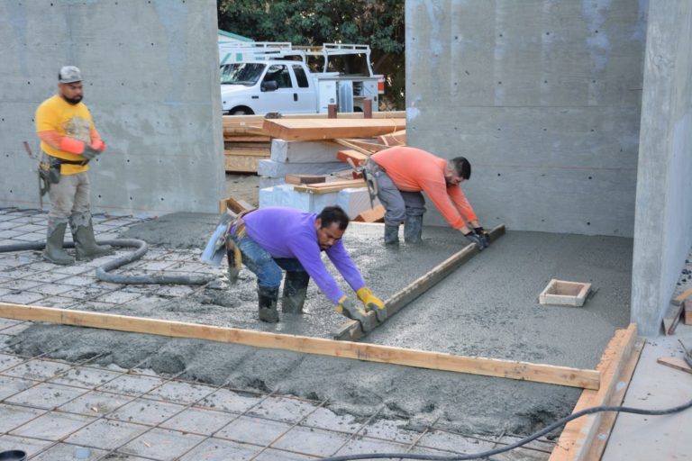 Today a lot of work got done, but it was sort of a crazy day. One of the big goals was to pour the slab in the garage and the slab in the great room. Picture 1 shows the slab in the garage as it is being smoothed. You can see how this has an odd shape because of the unusual way that we expanded the existing garage.