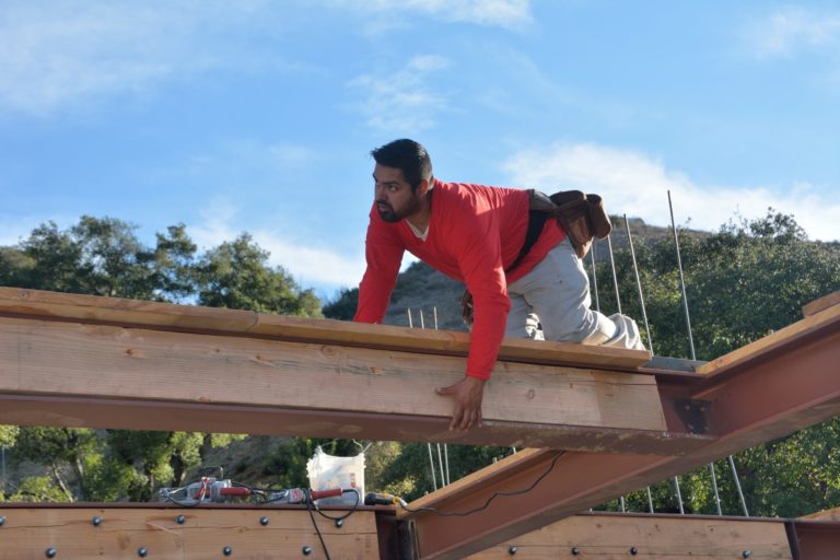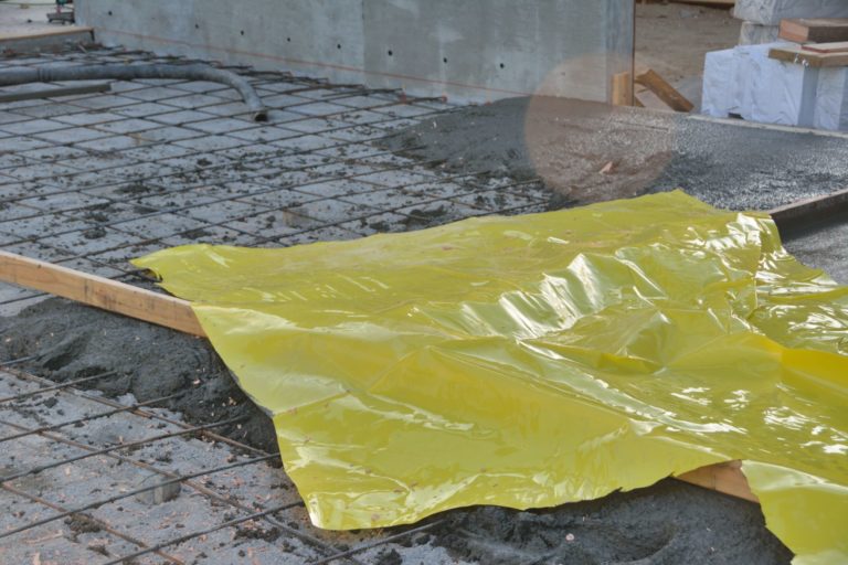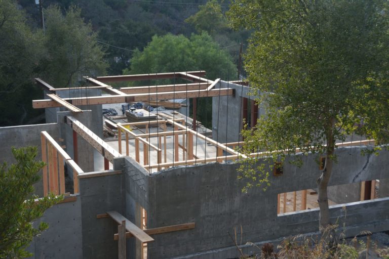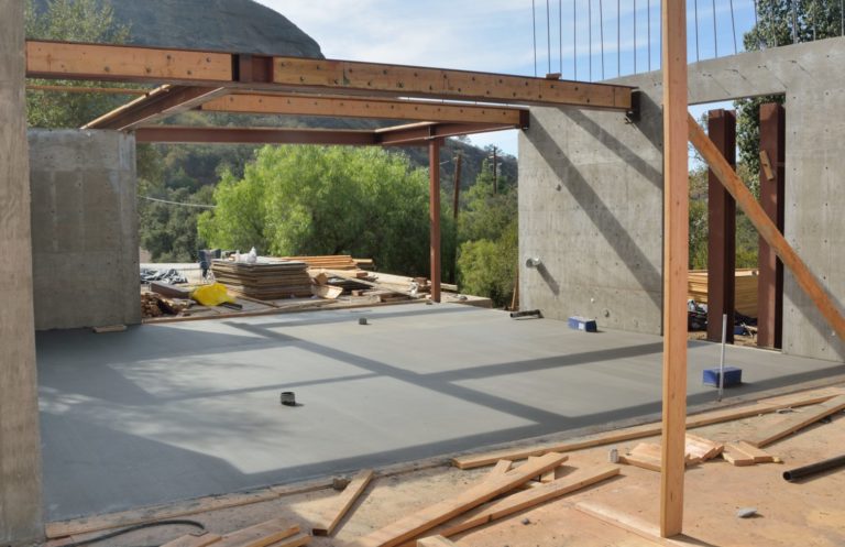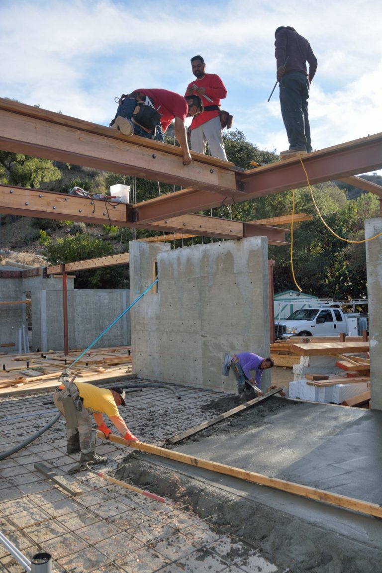 While they were waiting for the second truck to arrive — as usual, this took much too long — the framers decided that they needed to finish attaching the nailers to the steel beams above the great room (see Picture 3). Unfortunately, this created lots of sawdust and wood fragments that fell on the newly poured concrete. Picture 4 shows the concrete covered up to protect it.