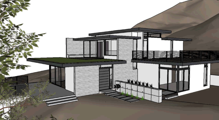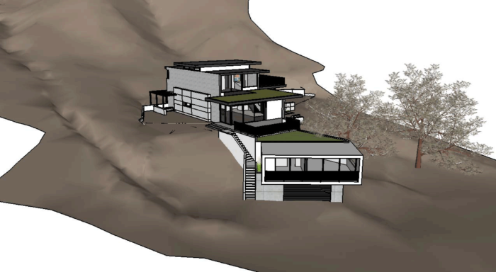 These two pictures give some idea of the overall project. Picture 1 show how the garage and house fit together. The lower deck is not shown. Picture 2 shows the other side of the house with the front door.
