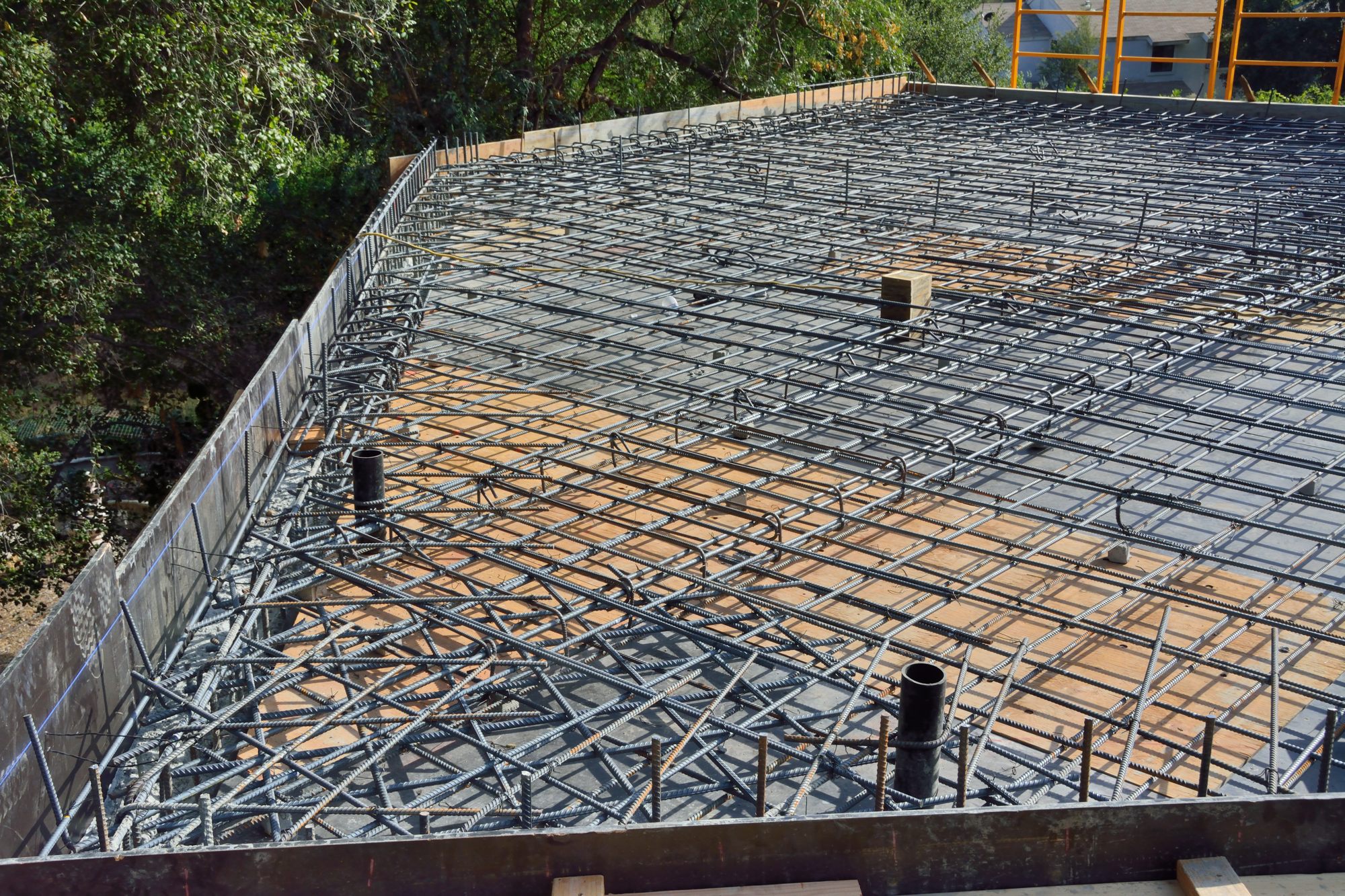 Picture 1 below, shows the completed rebar for the apartment roof and the wooden forms around the edge of the roof. We were appalled because they put these forms up leaning out from the roof — two stories up — rather than get scaffolding.