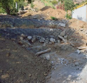 Today the bobcat arrived and they were able to move the blocks which held up the hill next to the garage to a spot on the side of the road that goes to the upper part of the property. We will save these to use to edge garden beds. The first picture is a photo taken yesterday of the hillside with three rows of blocks. The bottom row is mostly hidden. The second photo shows it as it is this evening. Picture three shows one of the sets of blocks neatly stacked up along the road.