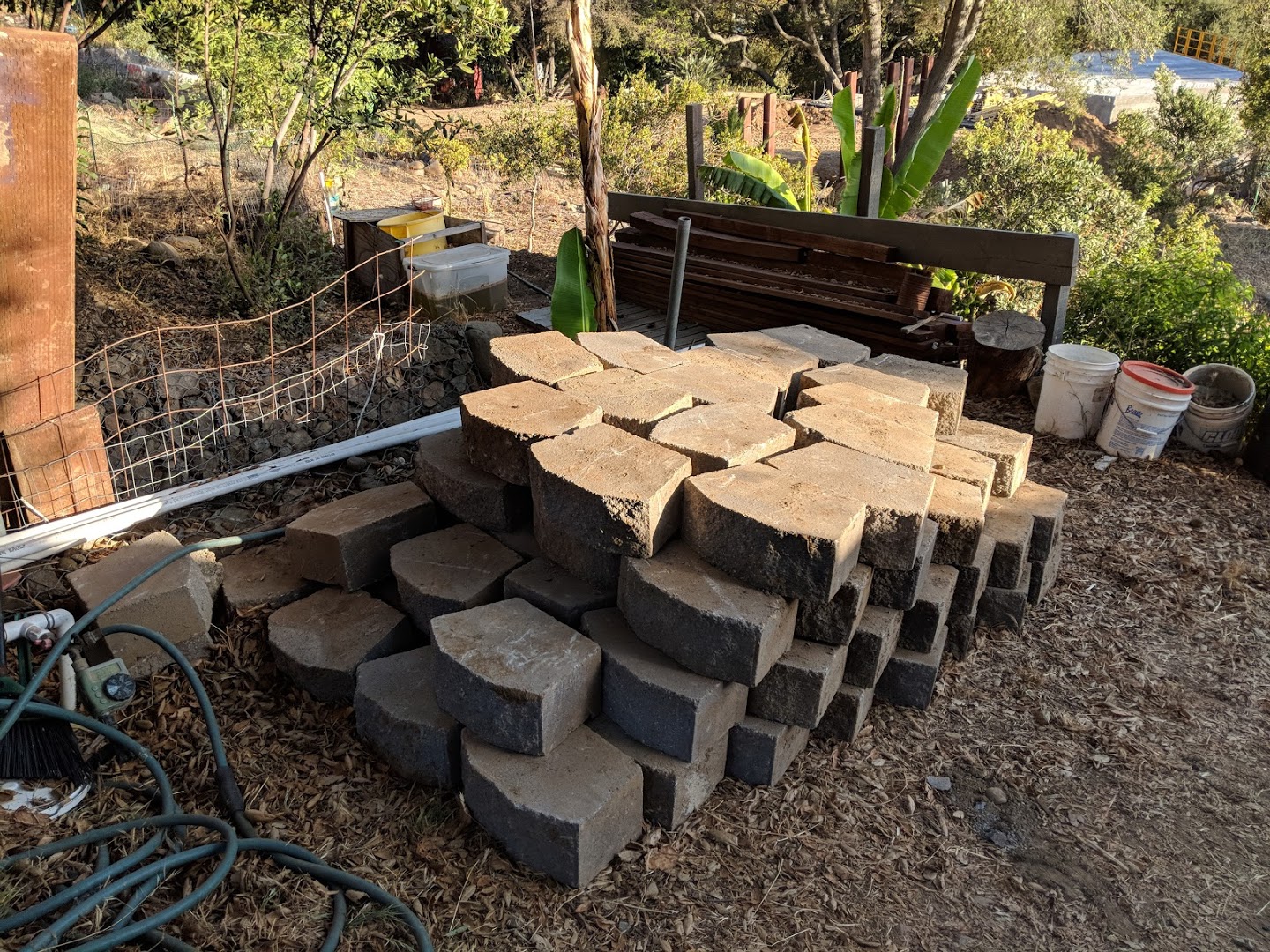 Today the bobcat arrived and they were able to move the blocks which held up the hill next to the garage to a spot on the side of the road that goes to the upper part of the property. We will save these to use to edge garden beds. The first picture is a photo taken yesterday of the hillside with three rows of blocks. The bottom row is mostly hidden. The second photo shows it as it is this evening. Picture three shows one of the sets of blocks neatly stacked up along the road.