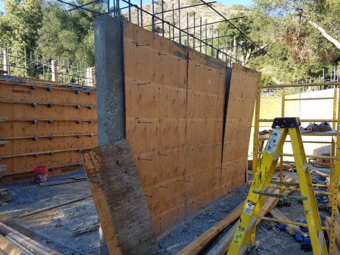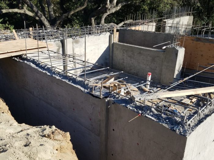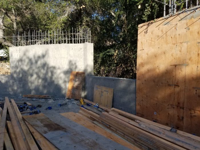 Today they began taking the forms off of the newly poured concrete walls and cleaning up the site in preparation for the work putting up the forms for the slabs that will be the house deck and the roof of the apartment. As the pictures show, they still have a ways to go to complete this.