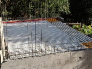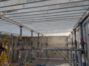 There was no post yesterday because the prop heads didn’t arrive, and there was no work for the guys. Today they brought a Bobcat and started working on additional digging in the back behind the garage wall. Then about 9:30, the FedEx truck arrived with the 437 prop heads, and they got to work putting up the posts and the racks. The two photos show the garage from inside and from up above. The racking company, who sent the wrong parts, also laid out with a computer where to put each post and rack. In the second picture, you can see that the racks are color coded. They have not yet done the tricky part in the back triangle part of the garage. Perhaps tomorrow.