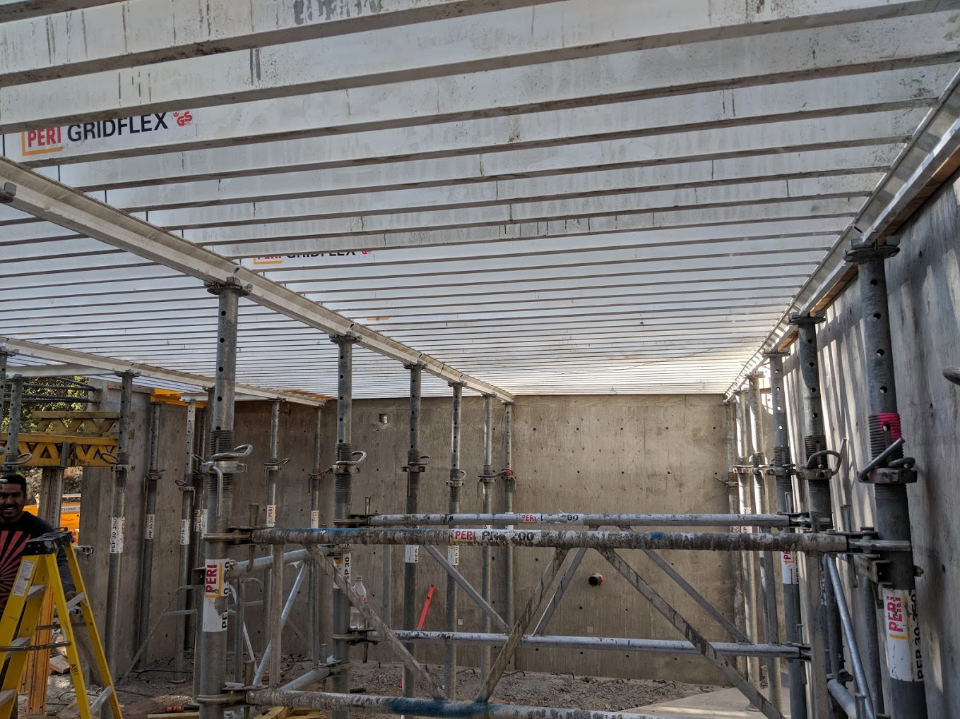 There was no post yesterday because the prop heads didn’t arrive, and there was no work for the guys. Today they brought a Bobcat and started working on additional digging in the back behind the garage wall. Then about 9:30, the FedEx truck arrived with the 437 prop heads, and they got to work putting up the posts and the racks. The two photos show the garage from inside and from up above. The racking company, who sent the wrong parts, also laid out with a computer where to put each post and rack. In the second picture, you can see that the racks are color coded. They have not yet done the tricky part in the back triangle part of the garage. Perhaps tomorrow.