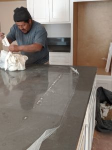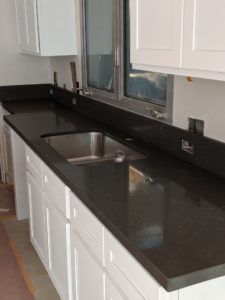 In the apartment, they finished the kitchen counters there too. The apartment bathroom counter has the same dark grey counter.