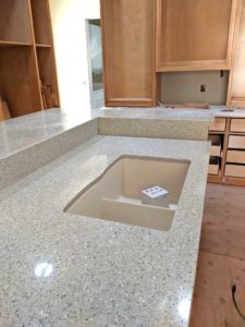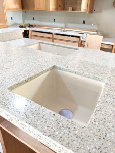 The counter people have been busy this week. We have full counters in both kitchens and the bathrooms. The first picture below is of Ted’s prep sink in the foreground and Nina’s washing sink on the lower level in the background. As you can see in the second picture, the counter is two heights, so that we have the high counter for Ted to work on and to have stools at the far end, and a lower height on the side with the dishwasher and large sink for Nina.