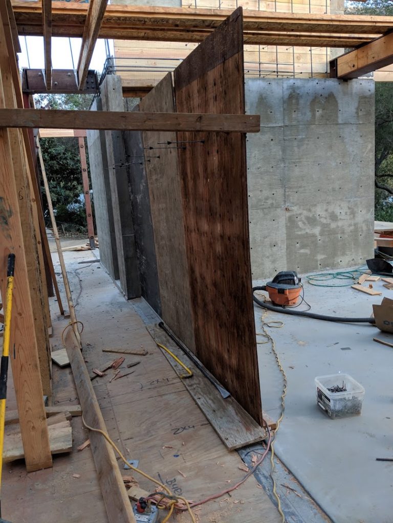 The concrete workers finished the board form lining for the wall by the door. They also began work on the lost concrete wall between the great room and the hallway to the bedroom. This is shown in the picture below.