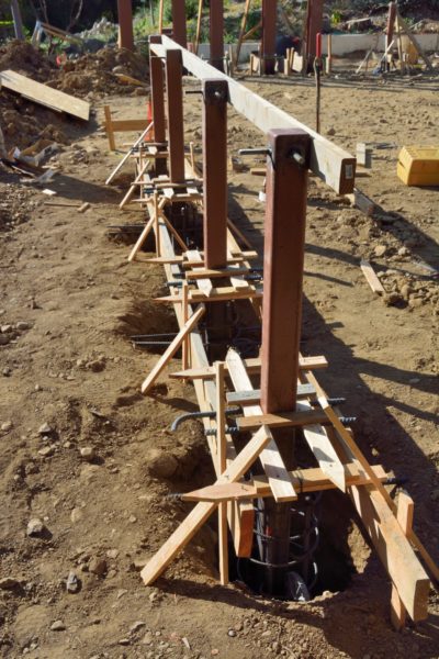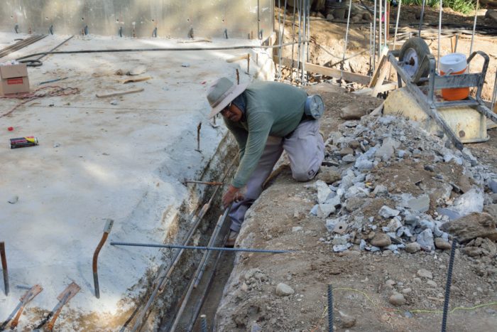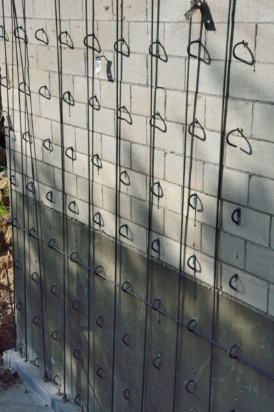 The two retaining walls that we are keeping from the old garages needed to be made stronger. To beef them up, they drilled holes on the inside of the current walls of the garage, filled them with epoxy, into which they embedded J-shaped pieces of rebar. You can see here, how they will then run long horizontal rebar segments through the resulting rings (there is one in place about a third of the way up from the bottom), and weave these together with vertical segments that start from holes drilled into the floor that have also be filled with epoxy. Once all of this rebar is in place and inspected, they will build plywood forms for the inside of this newly expanded wall.