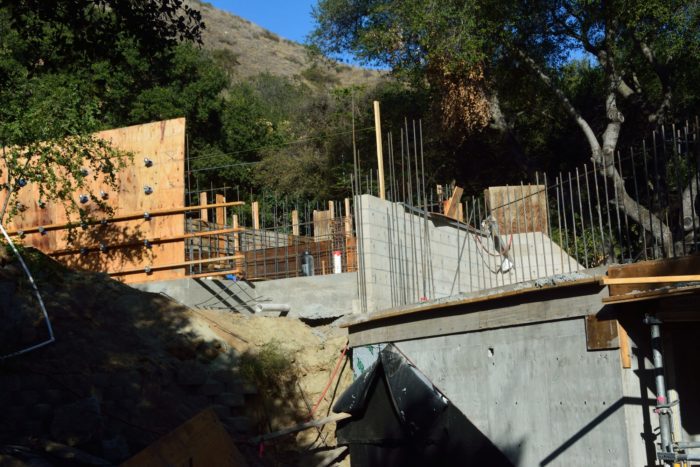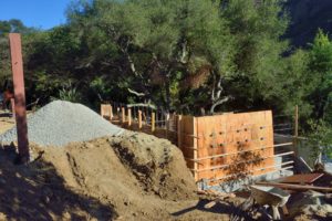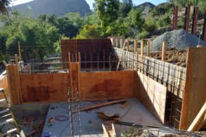 Picture 2 is looking down on this same plywood form from a spot west of the house. On the left side of the photo, you can see one of the vertical, steel, I-beams that will hold up the gabion wall that will stand on the west side of the house. To the right of that is a pile of gravel that they moved up from the bottom of the yard today. They will use this to backfill behind the wall between the house and the deck.