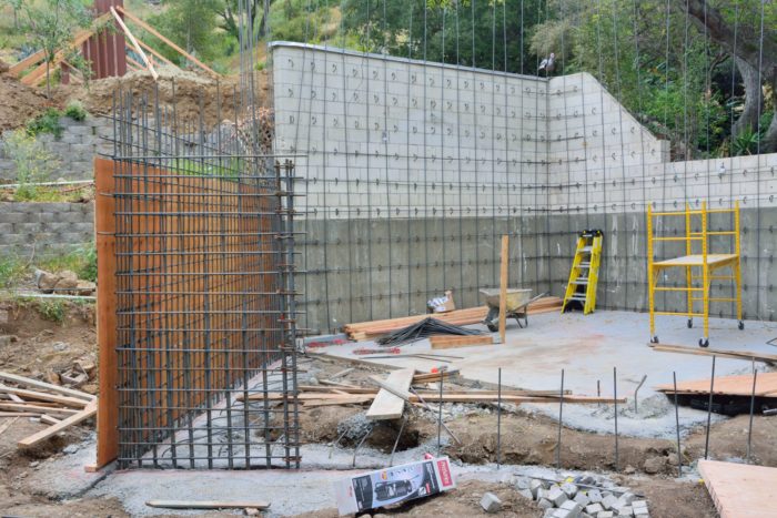 Finally, on the ground you can see the chalk line that indicates where the plywood form should go on this side of the wall. These concrete walls will eventually be 10″ thick.