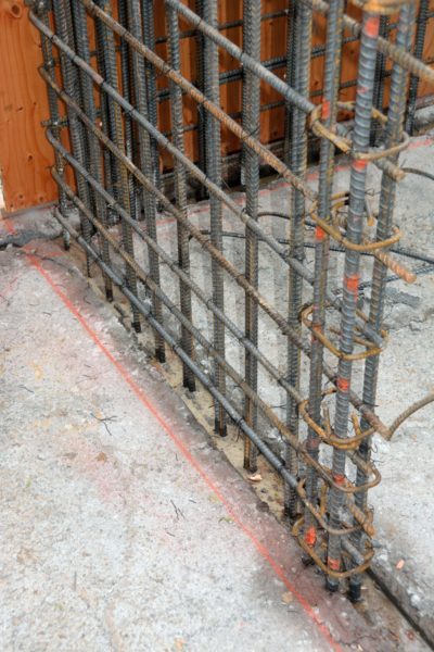 The photo on the right is a detail of one section of the base of the wall. I think this is interesting because it illustrates a number of the details of this process. It is a little hard to see, but half of the vertical pieces are coming from within the concrete below. These extend about 3 feet above grade. Next to each of these is another piece of rebar that begins at the concrete and goes up 12 feet, well past the where the first floor will be. These two pieces of rebar are tied together every foot or so with light wire. These vertical pieces of rebar are emerging from a 4″ wide slot in the base concrete called the “key.” Although the new concrete in the second pour will eventually bond chemically to that in the first pour, the key also holds the two pours together mechanically.
