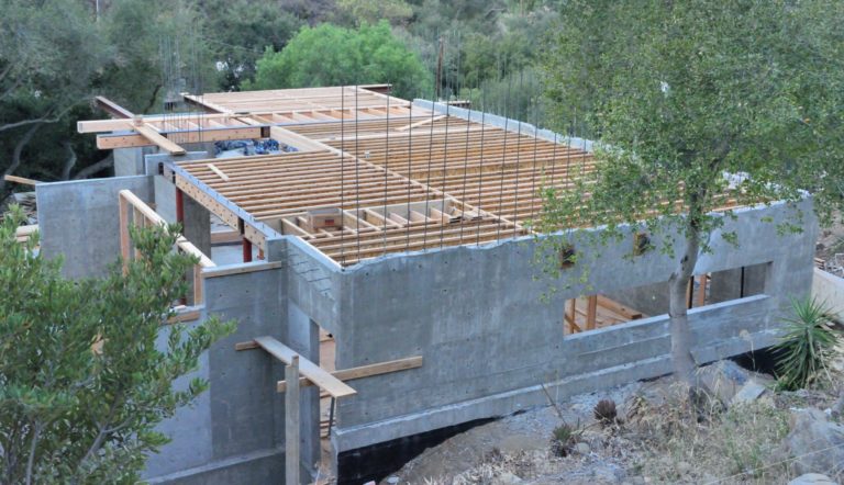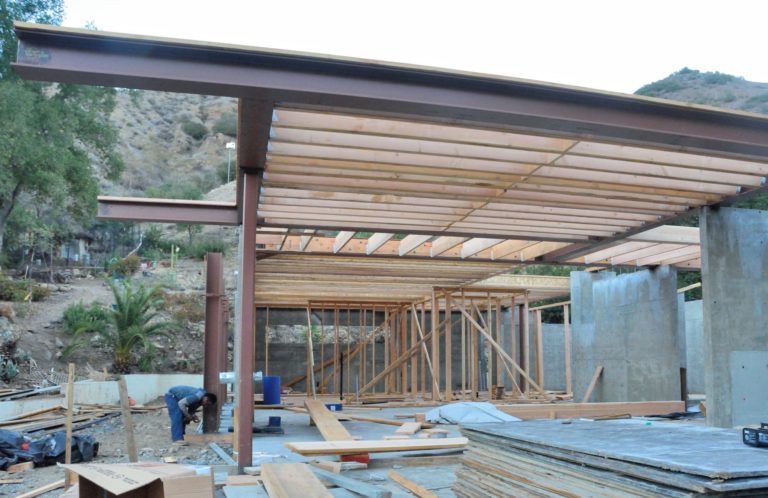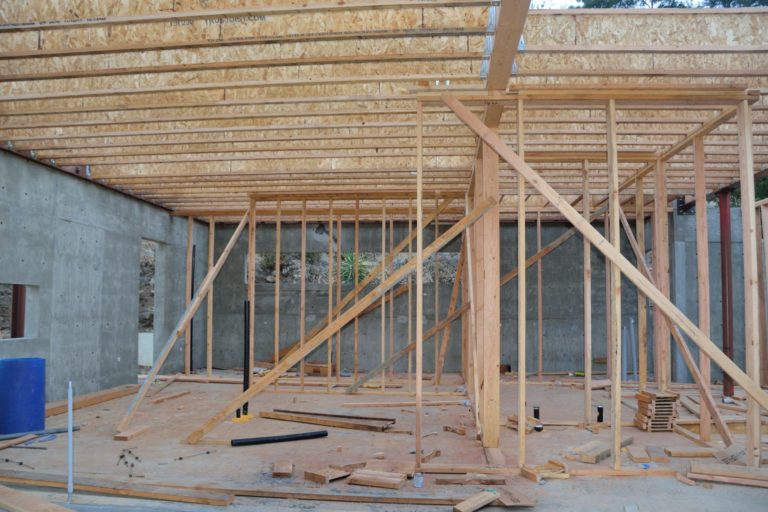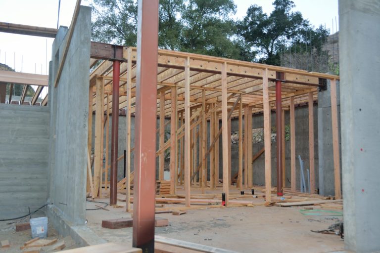 Picture 2 – Looking into the house from the deck. The closest steel beams and wooden joists are part of the 8′ overhang that will shade these windows with southern and western exposures.