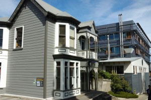 Otago is the oldest in New Zealand’s system of universities and has become the one of the universities with the strongest research focus. Psychology is the highest ranked of the university’s departments and so is well supported. One manifestation of this is the new William James Psychology building in which I am working, which is pictured to the right. This is probably not the most flattering picture of this modern building but it does highlight one of its more interesting, or perhaps arcane, features. The building has been designed to be energy and resource efficient. Although I cannot see it, apparently it has a grass covered roof. Rain water is captured and used for the toilets in the building — you can see that; the water in the toilets is brown. All the lights are on motion sensors – if you sit without moving for even 30 seconds they turn off. However, there is a lot of glass to let in light and many of the windows open. One potential problem with all this glass that the north facing windows (yes, north down here) can get too much sun. So, as you can see in this picture, each floor has a set of sliding, louvered shades that can be placed in front of windows with this problem. But how are such shades moved to the right place? I am told that in strong winds they move on their own. Yes, you can open a window and try to reach out and slide one a few feet. Just the thought scared me when I leaned out one of the windows to consider this. It appears that the “solution” is the set of walkways that you can see below the shutters. However, it is not clear how one actually gets onto these – they are too low to step onto from the windows – or who has to do it. Very strange.