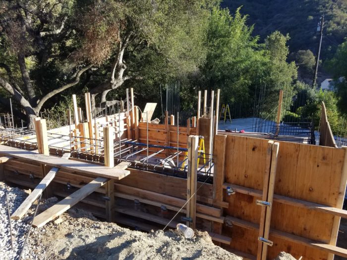 Today, they almost finished the framing for the walls supporting the deck and holding in the rainwater bag. You may be able to see some L-shaped rebar pieces extending horizontally into the interior space at the top of the forms. These will eventually be connected into the fabric of rebar that will give strength to the slab for the deck. The top surface of the deck will be the same height as the floor of the house and the top of the green roof that will be on top of the apartment above the garage.